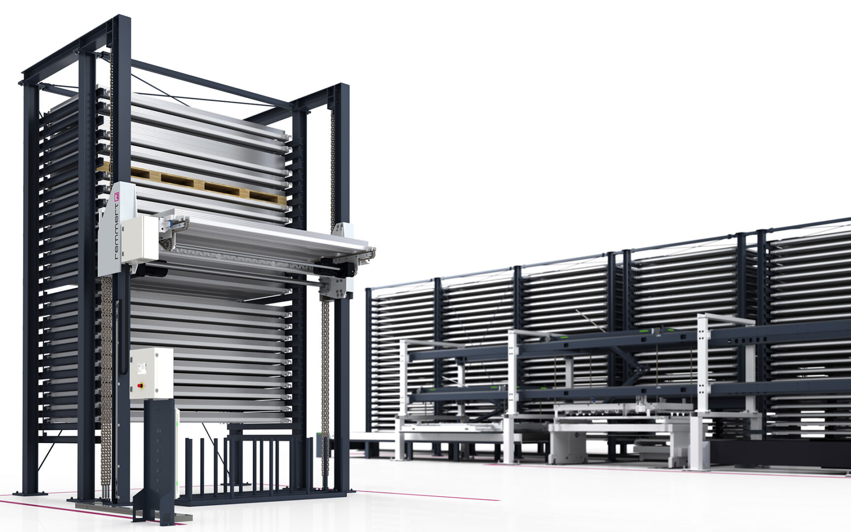 La BASIC Tower est la solution idéale pour les transformateurs de métaux qui souhaitent stocker des tôles à proximité immédiate de la production dans un espace réduit. Sa traverse de levage intégrée offre un accès rapide, sûr et ergonomique aux palettes de stockage.